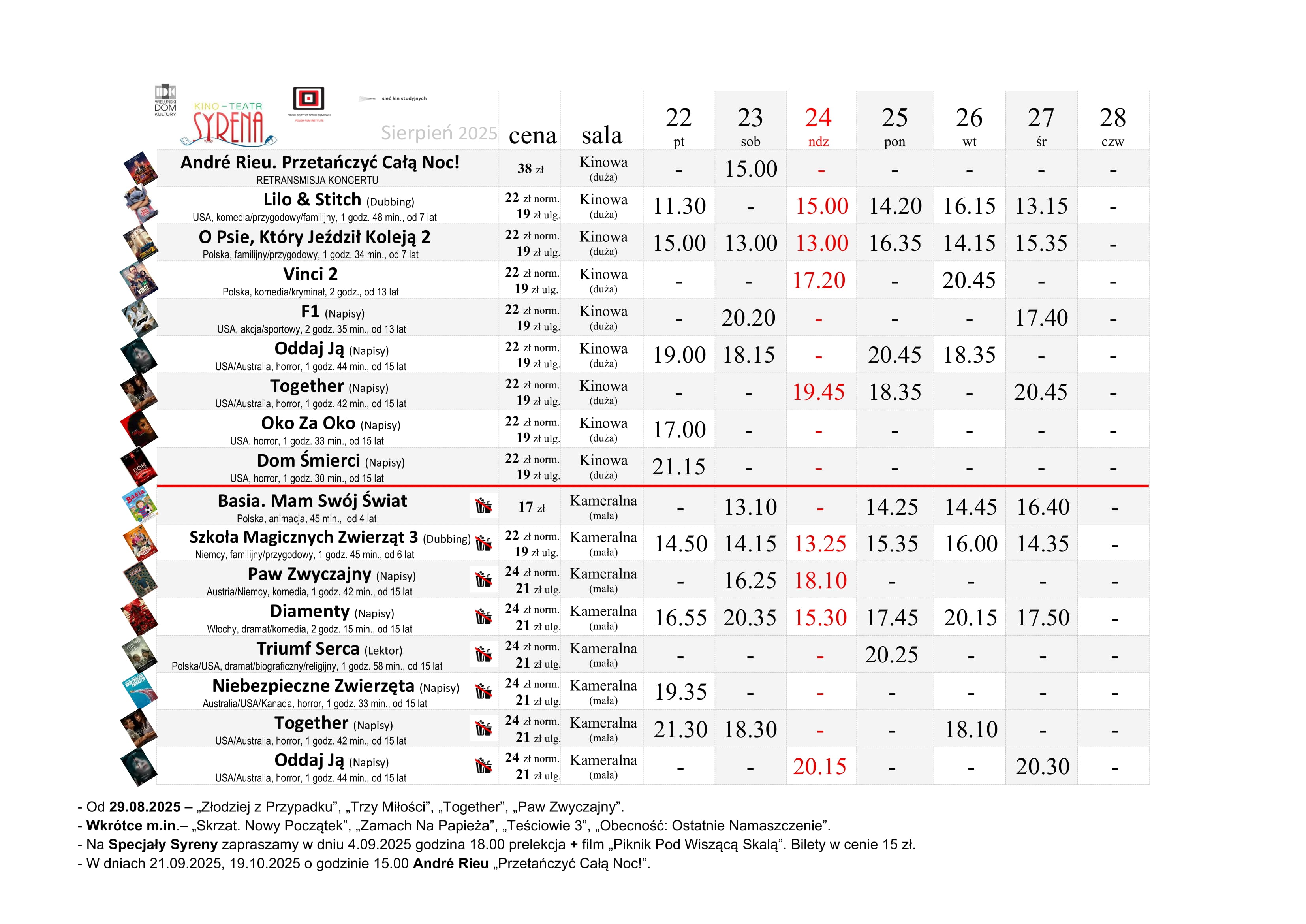 W dużej sali będą wyświetlane m.in.: „Lilo & Stitch” (komedia/przygodowy/familijny), „O psie, który jeździł koleją 2” (familijny/przygodowy), „Vinci 2” (komedia/kryminał), „F1” (akcja/sportowy), „Oddaj ją” (horror) oraz „Together” (horror). Zaplanowano też po jednym seansie horrorów „Oko za oko” i „Dom śmierci”, a w sobotę, 23 sierpnia – retransmisję koncertu André Rieu.