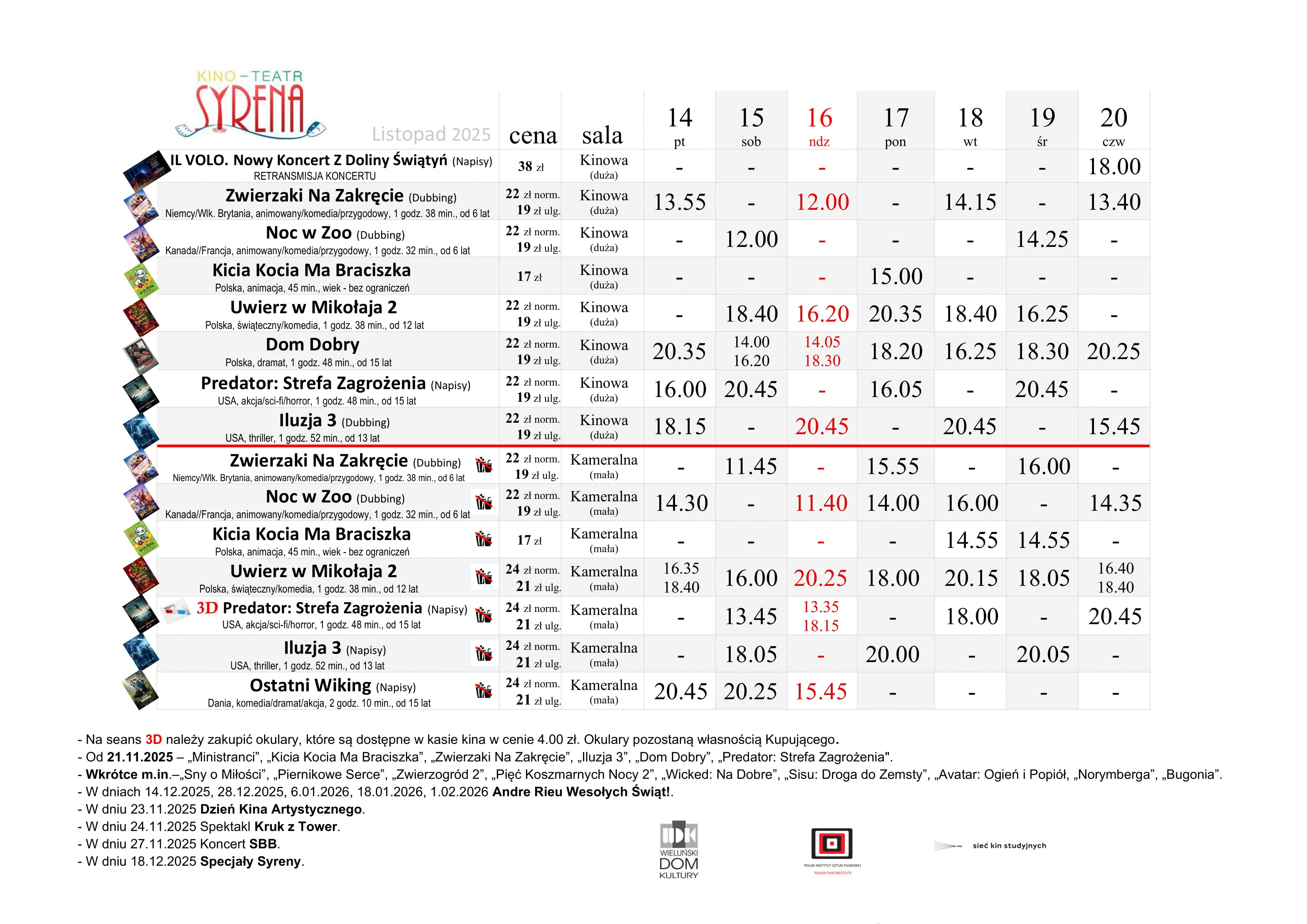 W nadchodzącym tygodniu w dużej sali kina obejrzycie filmy „Zwierzaki na zakręcie” (animowany/komedia/przygodowy), „Noc w zoo” (animowany/komedia/przygodowy), „Kicia Kocia ma braciszka” (animacja), „Uwierz w Mikołaja 2” (świąteczny/komedia), „Dom dobry” (dramat), „Predator: Strefa zagrożenia” (akcja/sci-fi/horror) oraz „Iluzja 3” (thriller). Będzie też retransmisja koncertu „IL VOLO. Nowy koncert z Doliny Świątyń”.